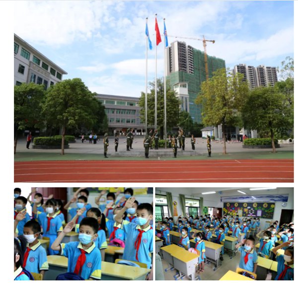 8时20分,雄壮激昂、熟悉的国歌在余靖小学里再次响起。15名国旗护卫队的学生代表在升旗台迎着太阳,将国旗徐徐升起,各班学生在课室同步进行升国旗、唱国歌仪式。