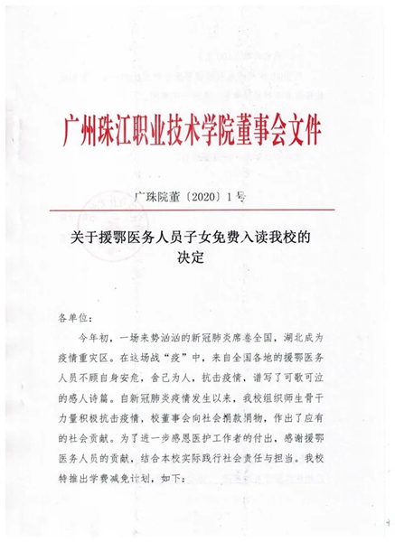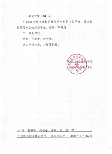 为感谢援鄂医务人员的付出,中华职业教育社团体社员广州珠江职业技术学院积极响应总社号召,决定用实际行动践行社会责任与担当。学校决定,2020年参加高考,报考广州珠江职业技术学院任何专业的援鄂医生护士的子女,可全额免除一年的学费、住宿费和教材费。此外,学校将为报考学校援鄂医务人员的子女提供勤工俭学岗位,支持申报学校各类奖学金,保障报考学校的援鄂医务人员子女圆满完成学业。