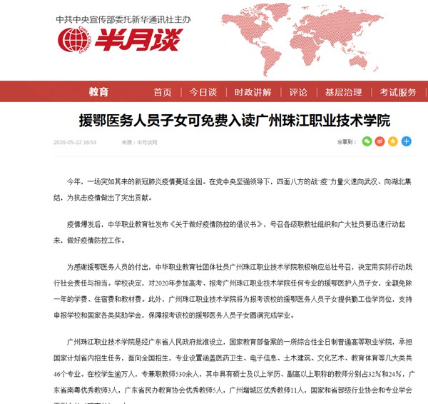 广州珠江职业技术学院免费招收援鄂医务人员子女报读,被中华职业教育社和半月谈报道