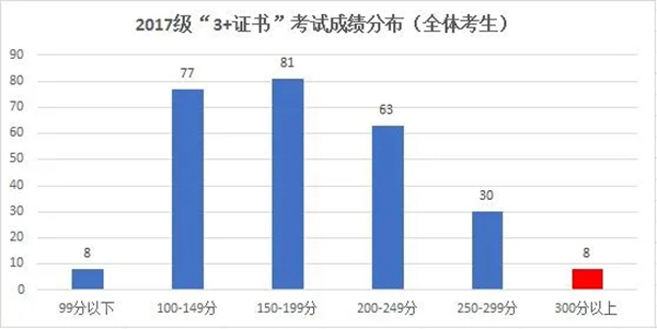 2017级参加“3+证书”考生中,最高分373分,达专科院校最低投档线100分以上的有259人,专科上线率97.0%,达本科院校投档线260分以上的有30人,本科上线率11.2%。
