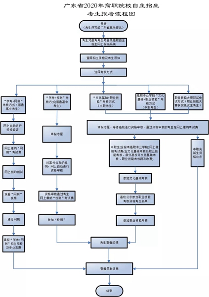 5月26日9:00至29日14:00,中职考生根据《广东省教育厅关于做好2020年高等职业院校自主招生工作的通知》(粤教考函〔2020〕1号)文件附件3报考流程图在网上报名系统(网址:http://www.eesc.com.cn/gzks)使用高考报名号及密码进行报名,在“文化基础+职业技能”(面向中职考生)、“高职专业学院试点班”(面向中职考生)及“职业技能大赛获奖免试生”(面向中职考生)三种考核方式中选择一种进行报考,根据系统指引上传相关证明材料后等待报考我校资格审核。考生缴交考试费后,将不得更改考核方式。考生如无法确认考核方式,需向我校招生处咨询并明确。