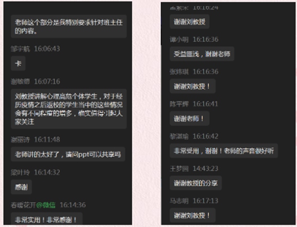 刘学兰教授将理论知识与实际相联系,用精湛的专业知识和生动的生活实例,深入浅出地为大家作了一场专业指导。两个小时的线上培训,大家意犹未尽,结束后纷纷表示受益匪浅,感受颇深,并对刘学兰教授的指导表达了真挚的谢意。