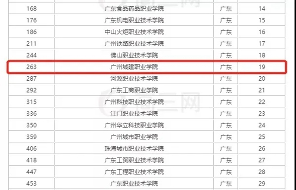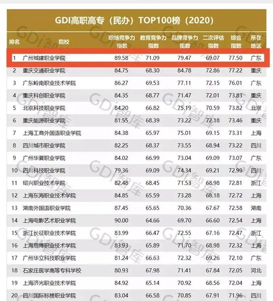 “GDI高职高专榜”中包括837所公办院校,164所民办院校,排名前121位的院校均属公办性质。前300强中有5所民办院校,其中——广州城建职业学院得分为77.50,在同类学校当中排名第一。